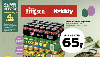 SuperBrugsen tilbyder en pakke med 24 x 33 cl. flasker af Faxekondi eller Pepsi Max til en pris af kun 65 kr. pr. pakke. Du kan vælge mellem flere varianter og købe op til 6 pakker pr. kunde. Tilbuddet gælder fra fredag den 27. marts til lørdag den 4. april.